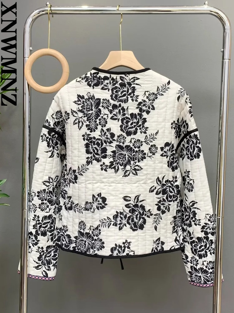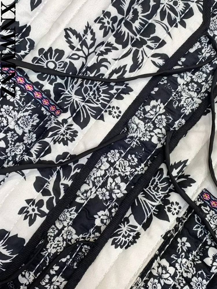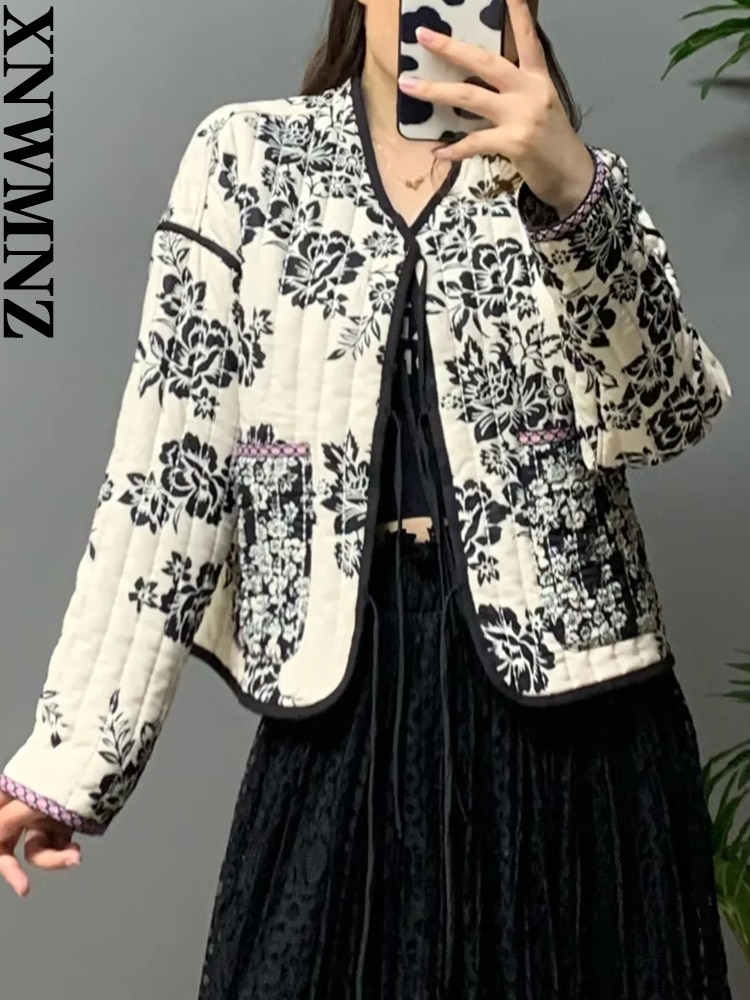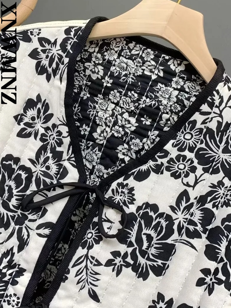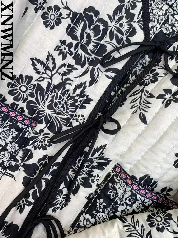 XNWMNZ 2022 Women Fashion Print Quilted Jacket Woman Retro V Neck Tie Winter Warm Padded Jacket Female Chic Reversible Jacket