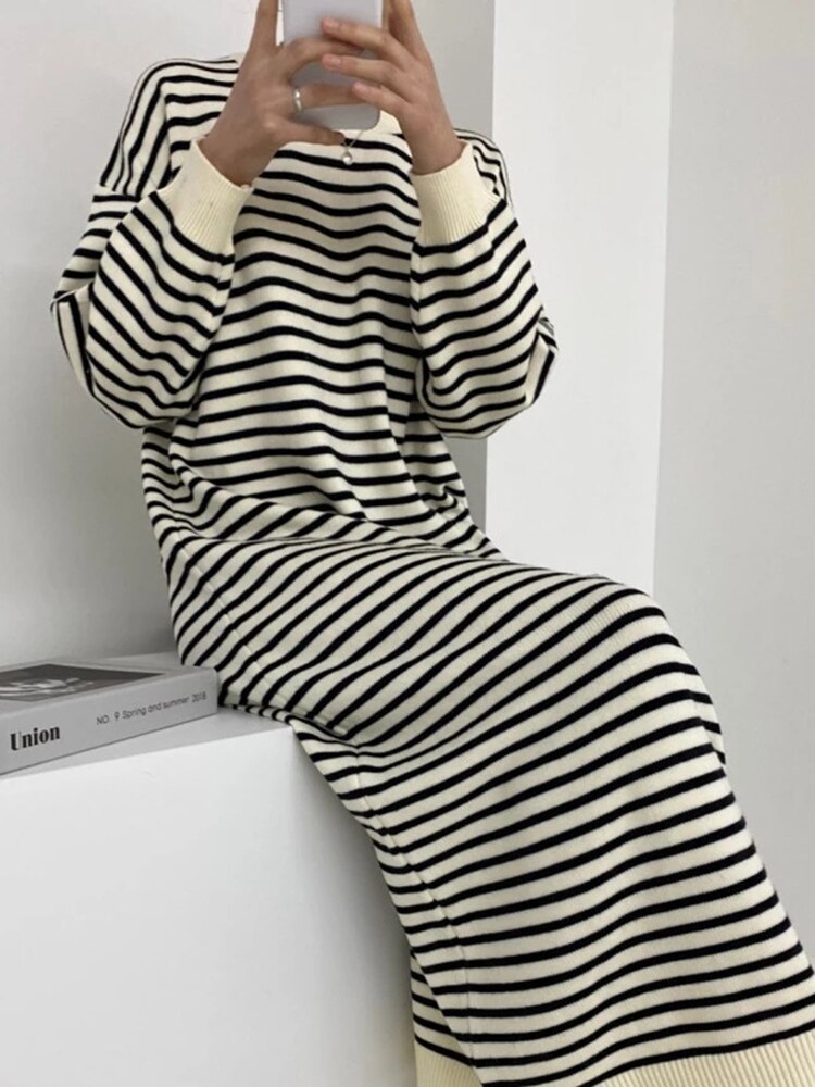 SHENGPAIAE 2023 Autumn New Large Size Long Sweater Dress Women Robe Loose Striped Knitted Sweater Casual Knit Dresses 5W910