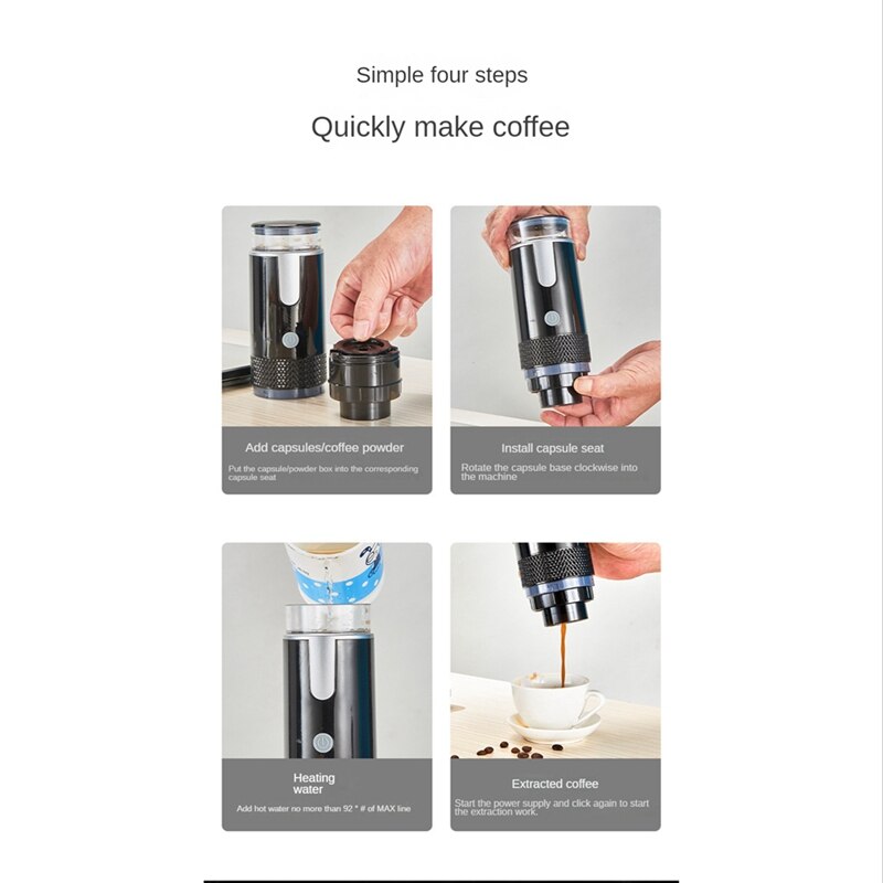 The portable coffee machine is fully automatic. Only need to clean the coffee cup, just press the switch button for 5 seconds to run the machine without capsules, it will automatically clean, more simple and convenient.