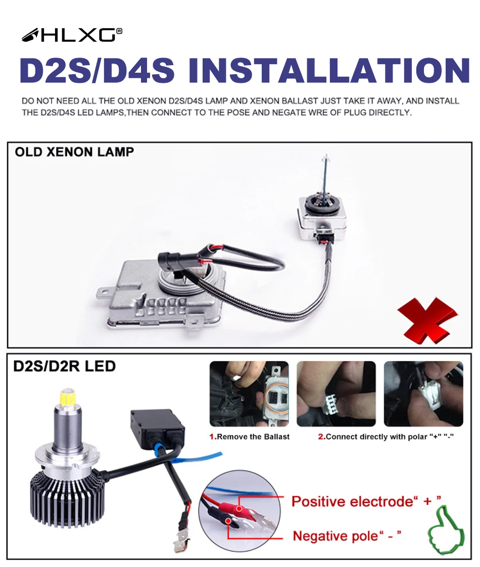 Do not need all the old XENON D2S/D4S lamp and XENON ballast, just take it away , and install the D2S/D4S LED lamps ,then connect to the positive and negative wire of plug directly
