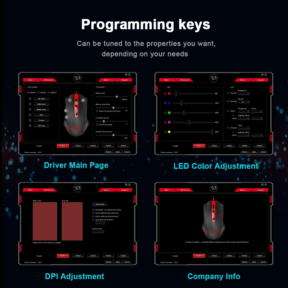 Total personalization: Driver : macro , button , light adjustable. 2 side buttons , 1 programmable fire button. Chroma lighting and breathing effects, featuring user adjustable DPI levels, 6 programmable buttons, 3 Memory modes .