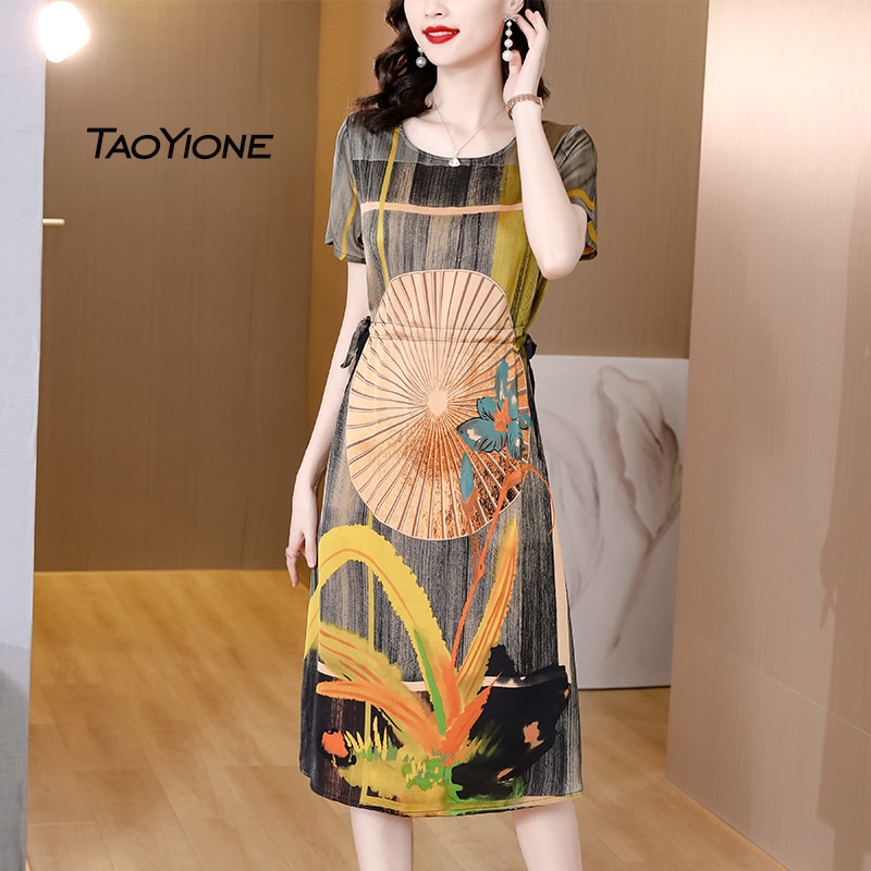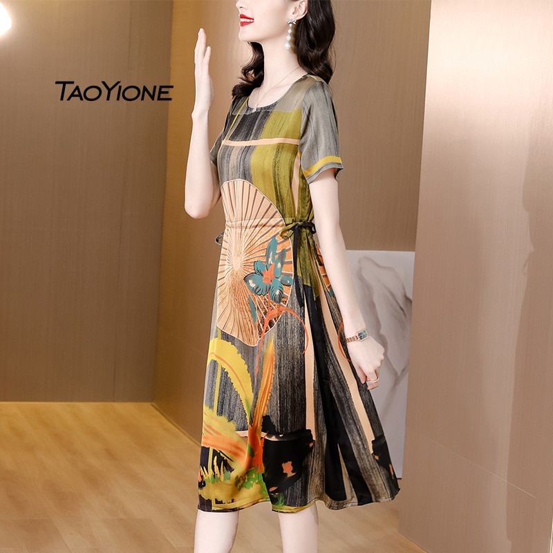Summer Vintage Print Silk Dress Women Short Sleeve Beach Party Dresses For Women 2023 Korean Midi Sundress Women Casual Vestidos