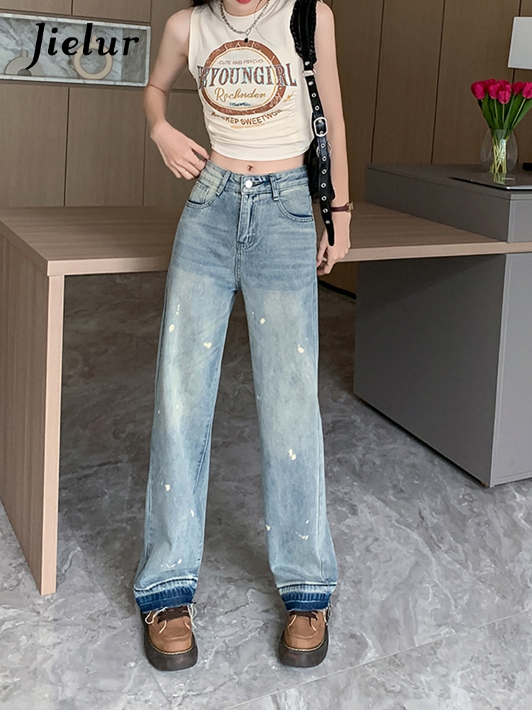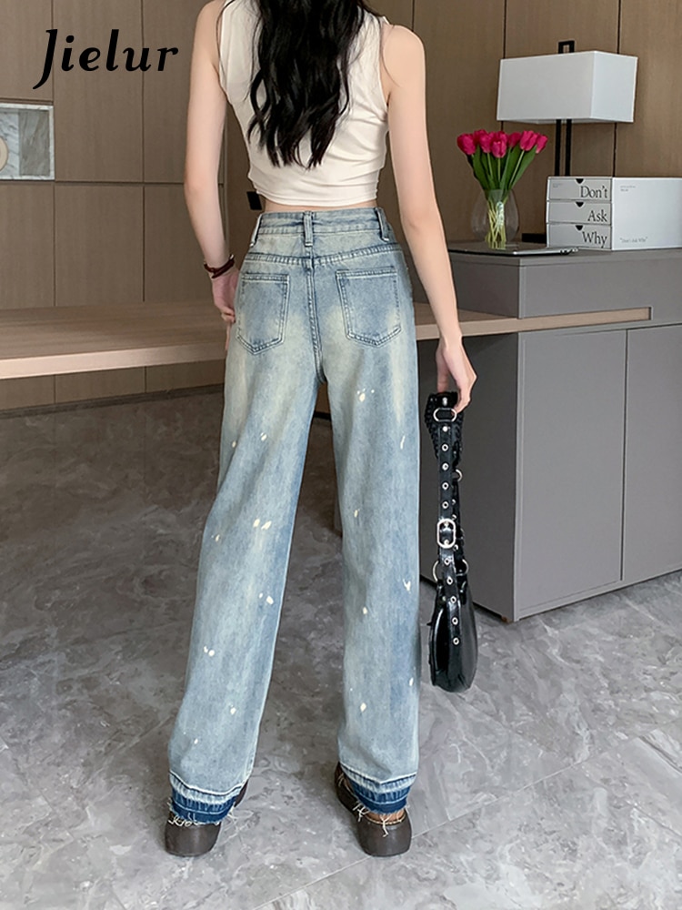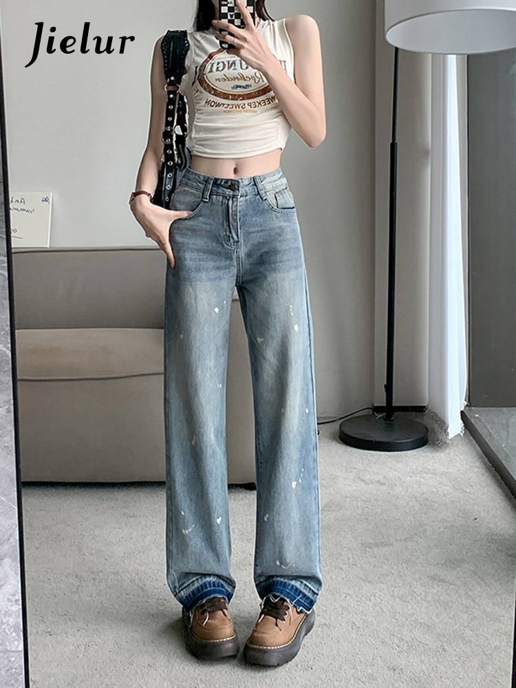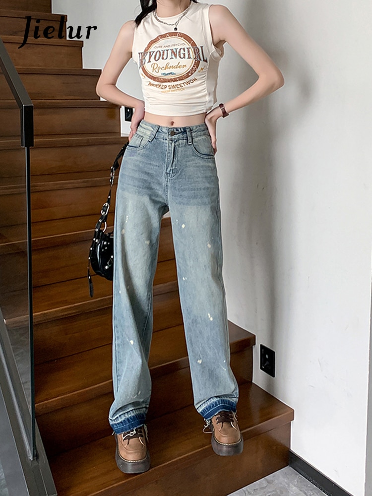 Jielur Vintage Mud Ink Women's Jeans Spring Korean Jeans Female New Fashion High Street Straight Loose Blue Denim Pants S-XL