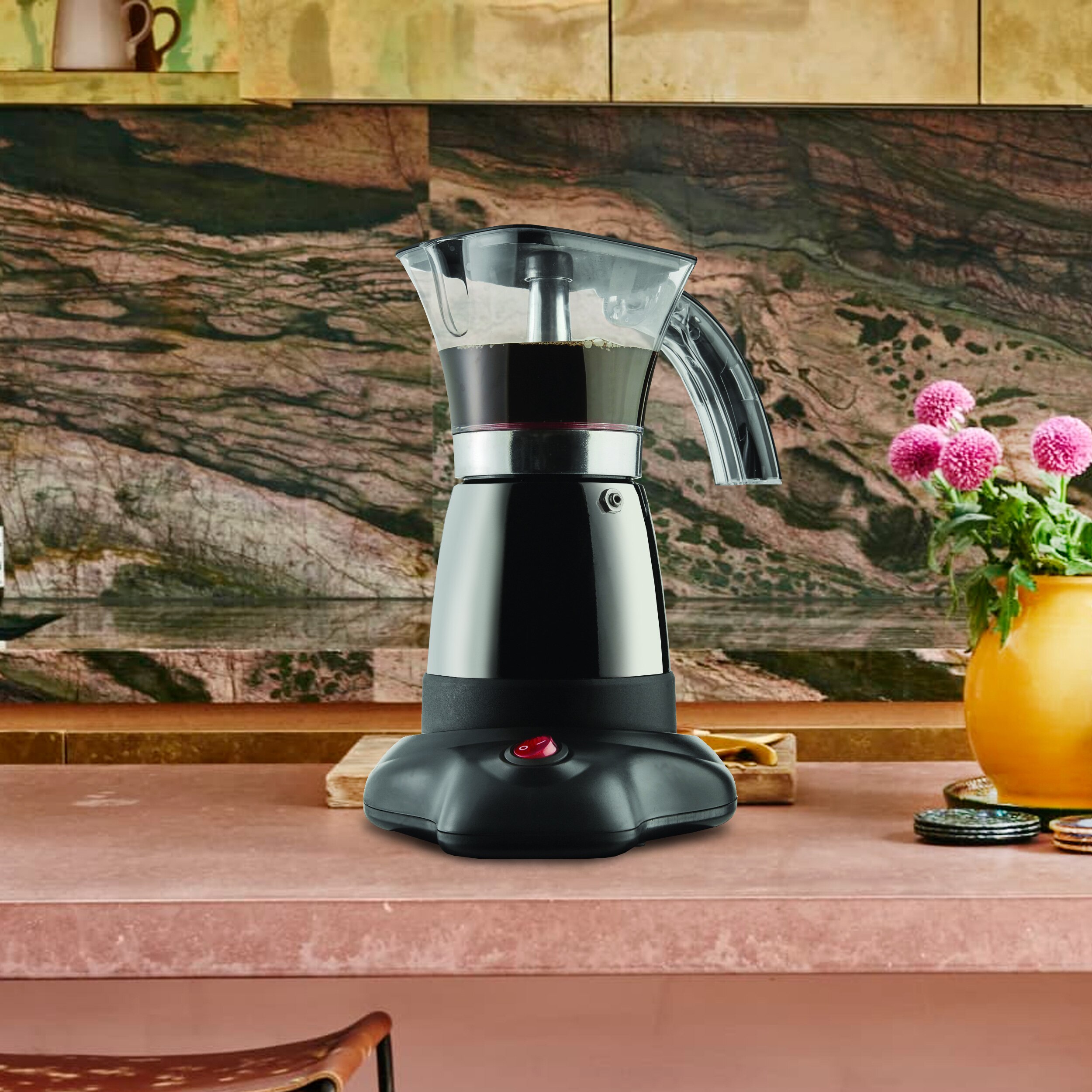 The Moka Expresso Maker efficiently brews 3 to 6 servings of espresso coffee at a time. The 480-watt expresso maker features a flip-up top and side-pour spout for easy serving. It also features a cool-touch handle.