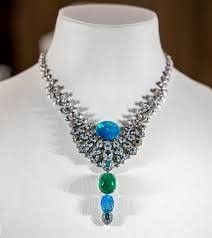 Of all birds, the peacock is possibly the most fascinating. The Ocelle necklace pays tribute to this bird with two opals weighing 16.59 and 6.19 carats respectively, and a 21.18-carat Zambian emerald pendant. The ocelli, the famous spots in the peacock's plumage, are miniaturised and multiplied into a stylised and graphic whole. Each motif is highlighted by an onyx trim. These small feathers partly overlap each other and are mobile enough to lift up slightly, thanks to invisible articulations which constitute the body of the necklace and provide it with extreme suppleness. The opals and emerald are cut and mounted on the pavilion to allow an invisible setting. The upper opal may be detached and worn as a brooch.
