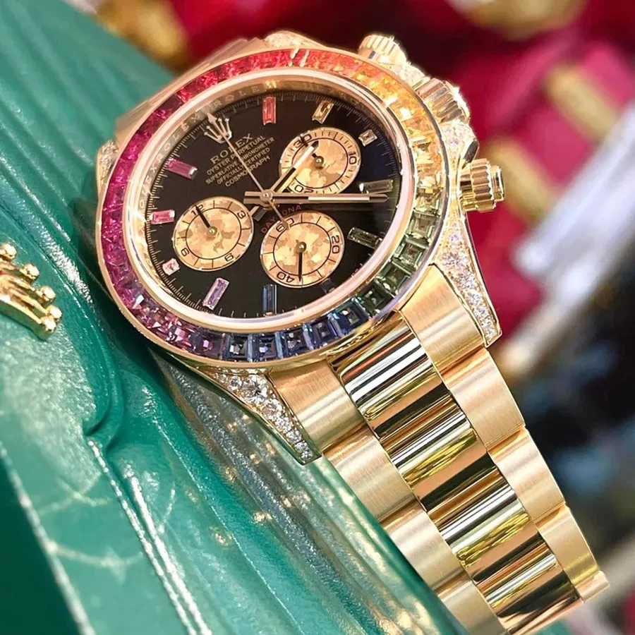 Phần dây đồng hồ Rolex 116598RBOW cũng được thiết kế từ vàng vàng 18K cao cấp. Dây đeo Oyster 3 mối nối với mối nối ở giữa được đánh bóng và tương phản rõ rệt với 2 mối nối 2 bên được chải xước mờ. Phần khóa được trang bị khóa Oysterlock 2 chốt, giúp người dùng tránh tình trạng rơi đồng hồ khi không để ý.