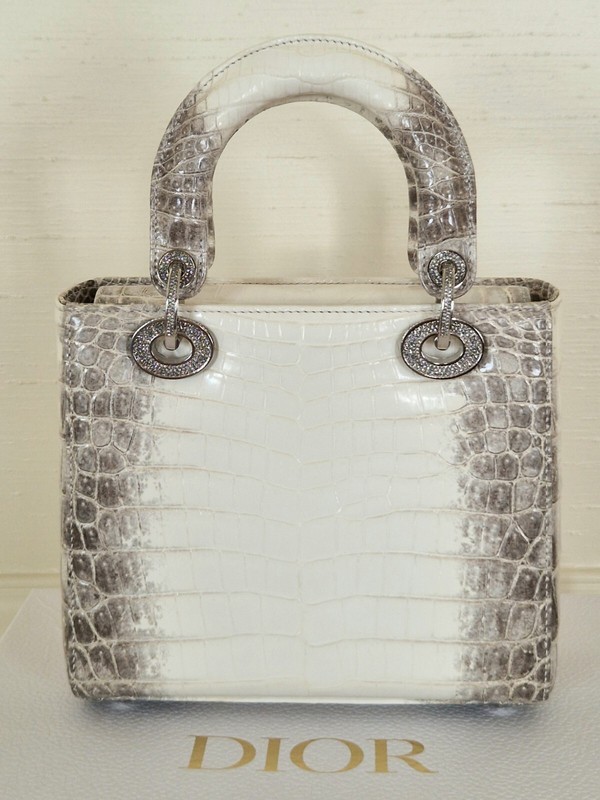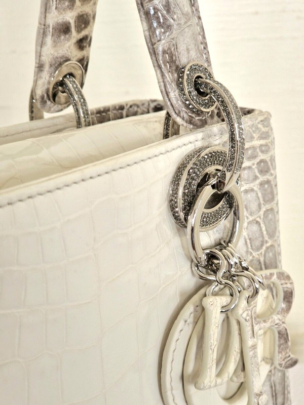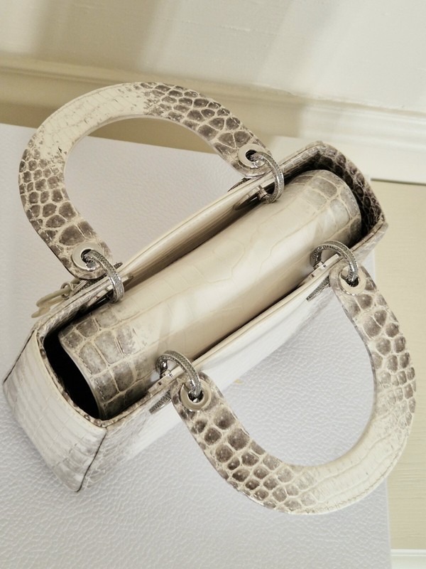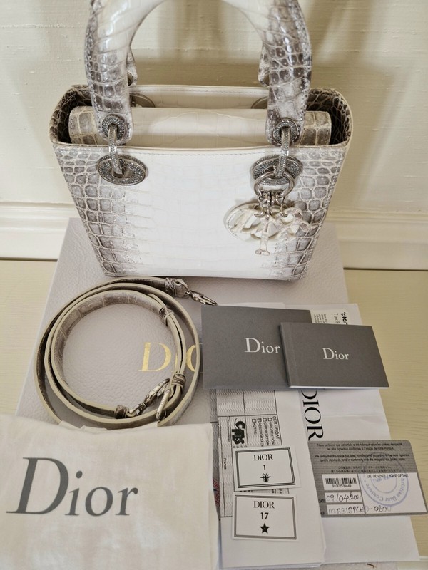 Like new. Only used once for gala event. Full set as shown in the photos.Comes with box, dustbag, authenticity card, care booklet, CITES documents, original receipt, shoulder strap. Christian Dior Himalayan Lady Dior in Niloticus crocodile creamy white ombre leather, with crystal encrusted hardware and DIOR charms fully wrapped with Himalayan crocodile leather.