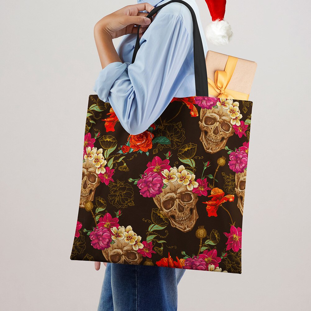 Day of the Dead Floral Skull Print Tote Bag Handbags for Women Halloween Sugar Skull Girl Shoulder Bags Large CapacityItem Name: Tote BagMaterial: Linen PolyesterSize: 40×40 CM/15.7×15.7 inchesDesign: as picture showPacking List: 1* Tote BagFeatures:*Eco friendly high quality linen material.*Novelty and beautiful Design.Eco-friendly imported ink printing and dyeing.No harm to health .*Foldable,Practical and reusable . Very useful when go out and environment friendly*Used as 1) Tote Bag (personalized casual tote bag for daily use. both for fashion women & men.) 2) Shopping Bag (foldable & reusable&eco friendly)3) Storage Bag (home storage for clothes,toy, books,bedding,sundries ,etc) *We support Drop Ship , Wholesale and Personal Customized , welcome to contact us.Friendly Notice:1) All tote bags are handmade, there may be 1-2cm deviation exist. 2) Actual color may be slight difference between the monitor display picture because of the light brightness.
