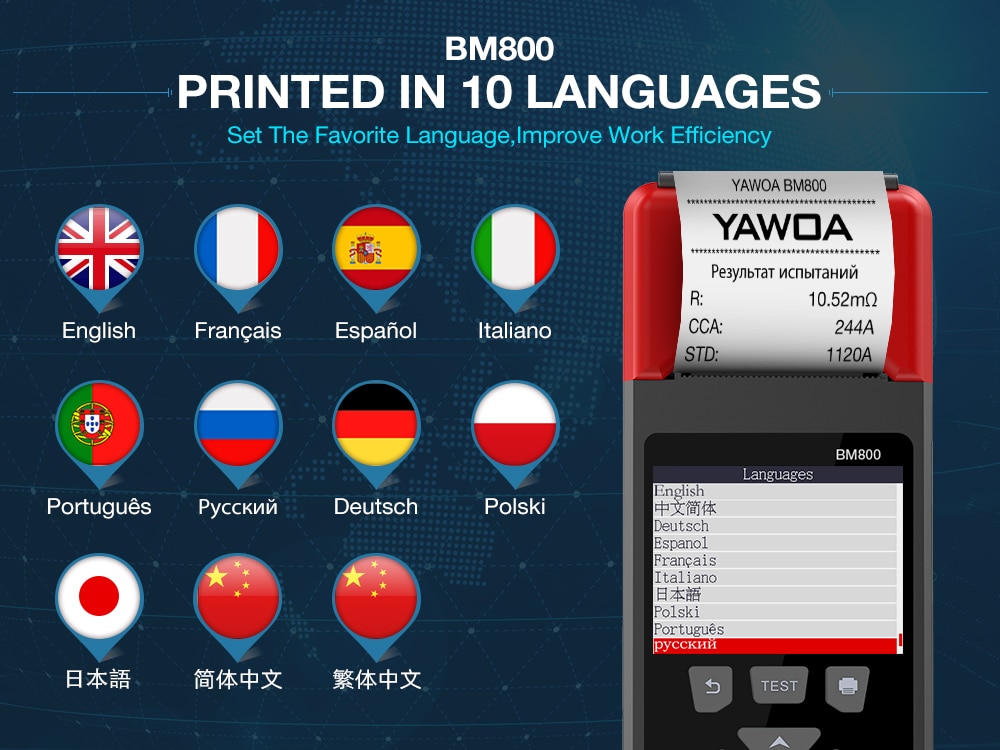 Note : BM800 not only supports diagnosis in 10 languages, but also supports printing in 10 languages ( the other battery tester only support print English )