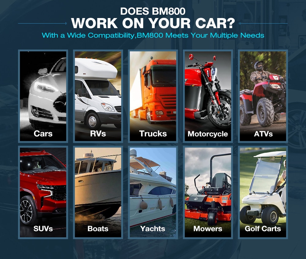 BM800 support 6V Motorcycle,12V Car & 24V Duty Truck Battery