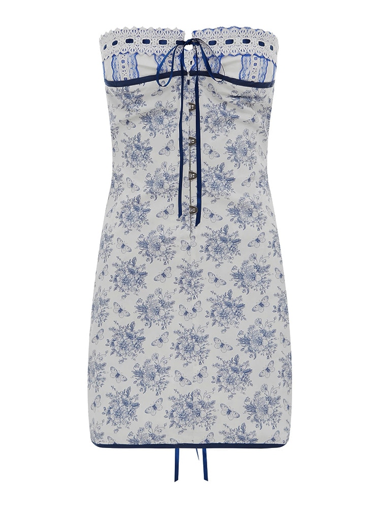 JULISSA MO Floral Printed Vacation Women Dress Off-shoulder Blue Metal Button Spring Skinny Elegant Outside Female Mini Dresses