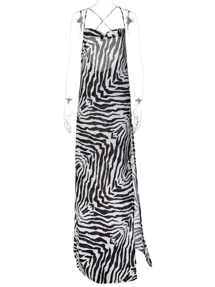 Sexy Spaghetti Strap Side Split Beach Dress Summer Sundress Women Clothes Elegant Zebra Back Open Club Party Dresses