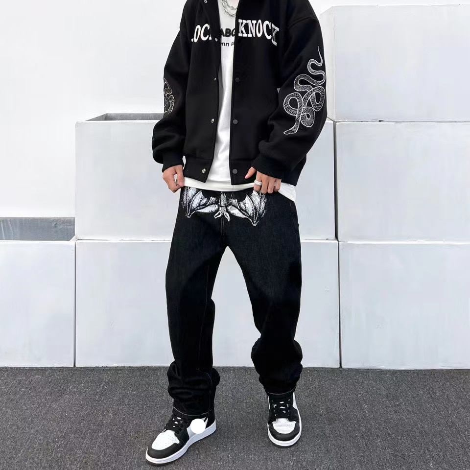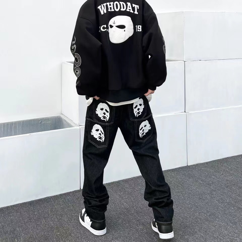 Y2K Korean Men Fashion Black Streetwear Casual Skull Straight Wide Leg Cargo Pants Baggy Denim Trousers Low Rise Jeans Clothes