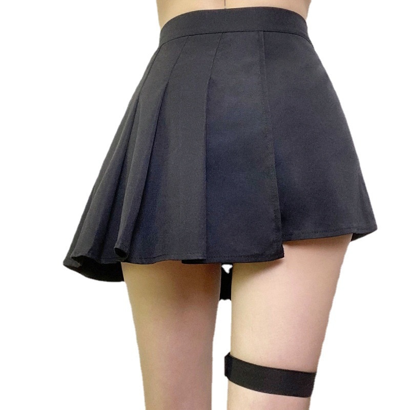 Black Leg Ring Asymmetrical Pleated Skirt Lining Metal Buckle High Waist Slim and Fresh Short Skirt Skirt