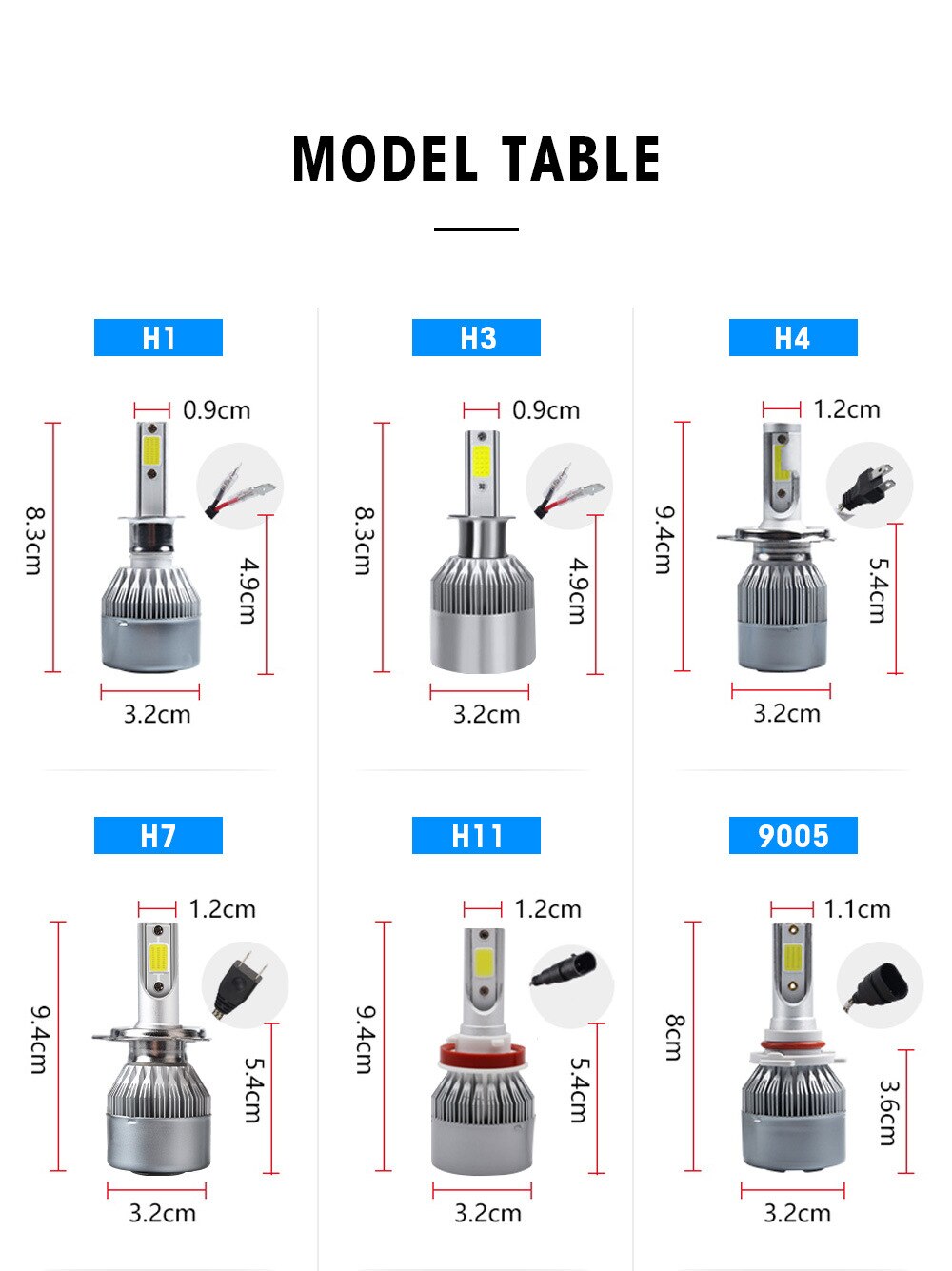 Socket Type: H1/H3/H4/H7/H8/H9/H11/9004/9005/9006/9007