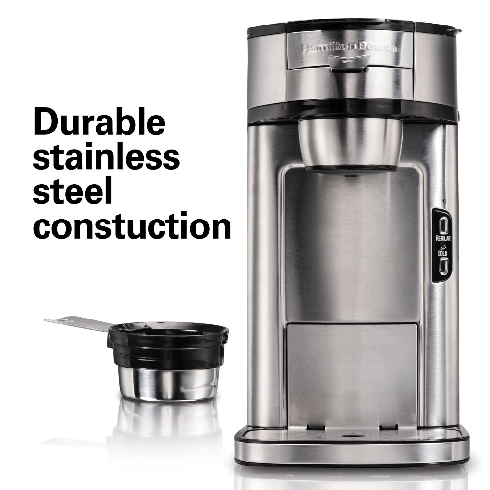 The Scoop® Single-Serve Coffee Maker by Hamilton Beach® makes getting a cup of great tasting coffee so easy. Simply scoop your favorite ground coffee, place into the machine, and brew. The mesh  doubles as a scoop so there's no need to measure and pour coffee grounds. You also get more versatility now you can easily and quickly brew a single cup of coffee using your favorite coffee brands and flavors. Not only is this single-serve coffee maker versatile and easy to use, it doesn't use K-Cup® pods or paper   so there's less to buy and less waste. The coffee maker brews at a high temperature in minutes for great tasting, flavorful coffee. It brews fast for 14 oz. of fresh coffee in minutes. With the adjustable stand, you can brew into different size cups and travel mugs. Make stronger coffee when you need it, with regular and bold brew strength options. The coffee maker automatically turns off immediately after brewing each cup of coffee for peace of mind. The included mesh   scoop is dishwasher safe and easy to clean. The single-serve coffee maker is made to last with durable stainless steel construction.