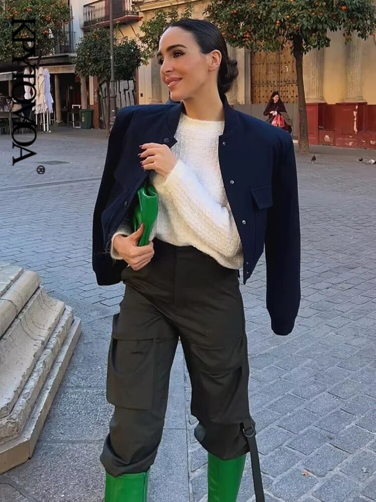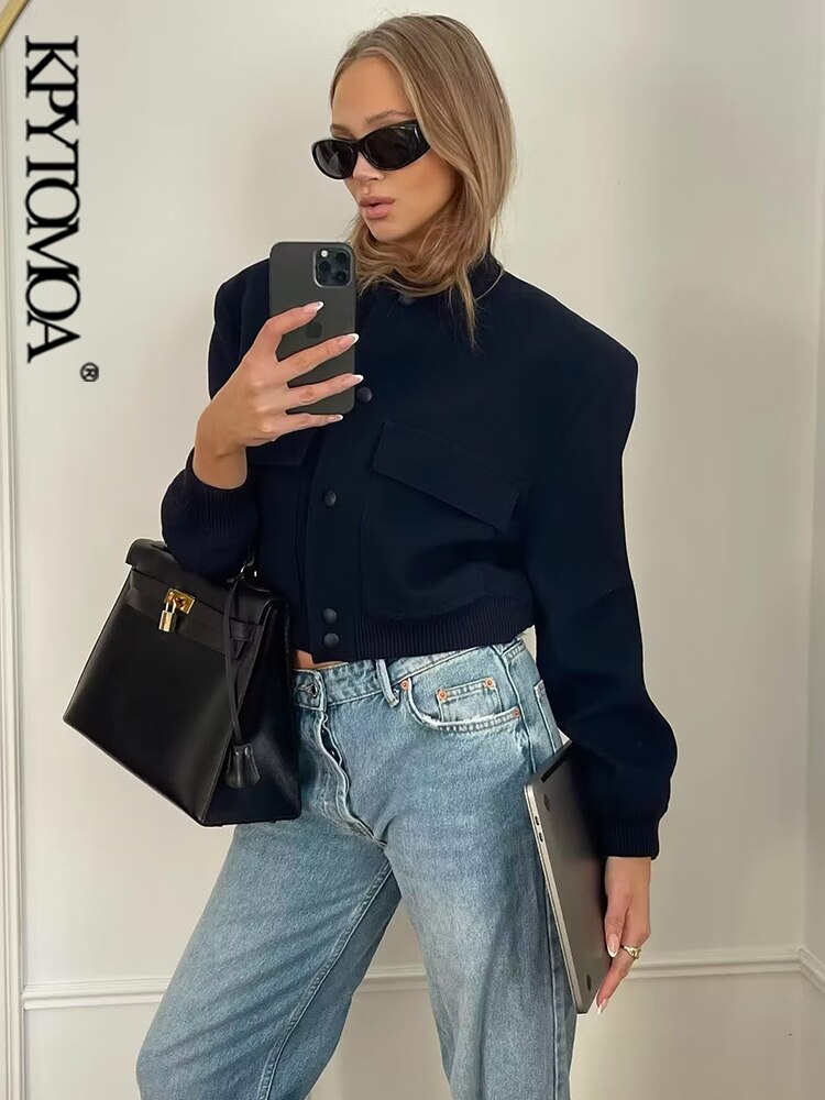 KPYTOMOA Women Fashion With Pockets Loose Bomber Jacket Coat Vintage Long Sleeve Front Button Female Outerwear Chic Tops