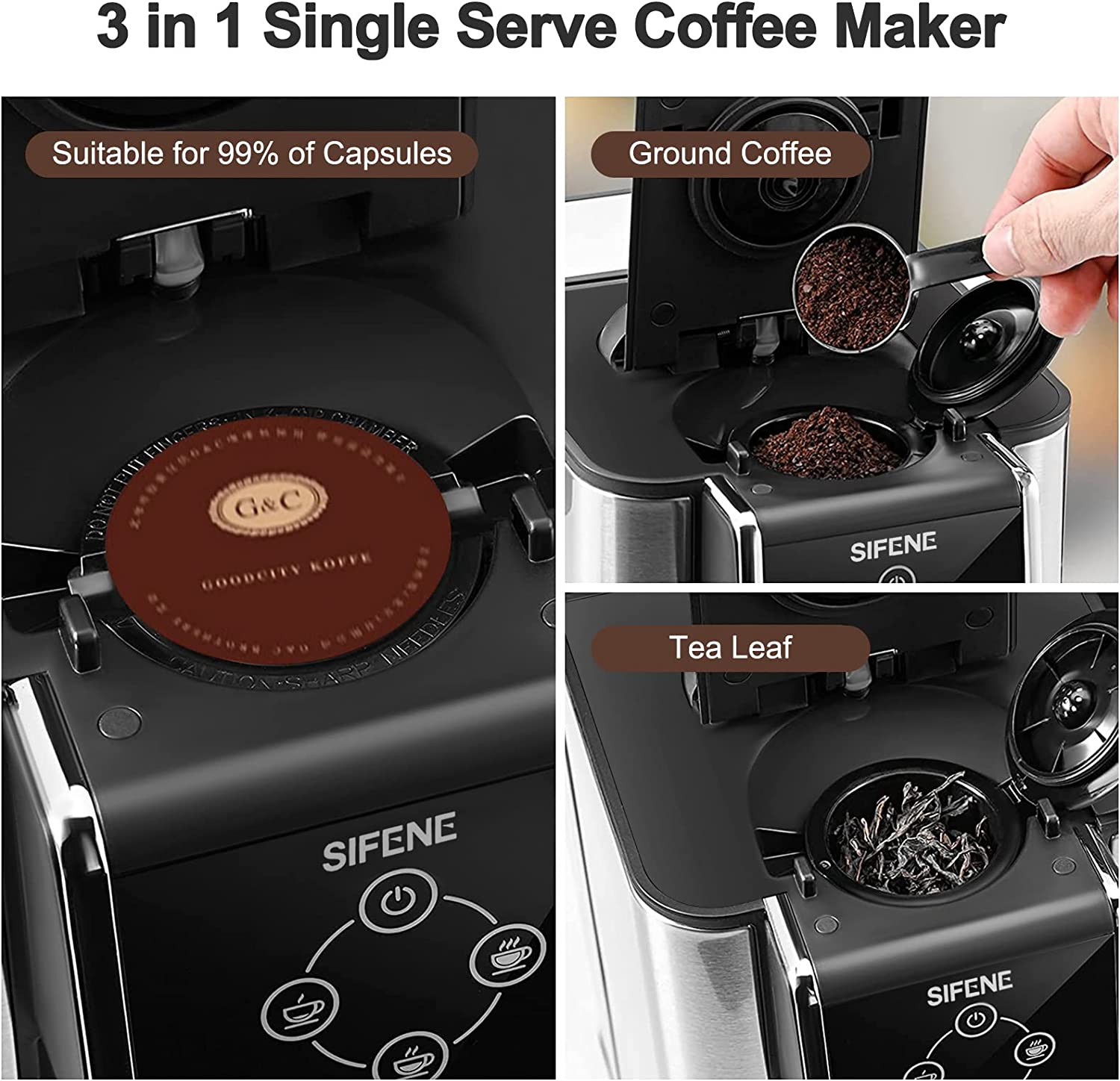 - 【3 in 1 Brewer Styles】 The single serve coffee maker has a reusable single serve pod adapter and two filters for coffee and tea. You can use Single Serve pods that fits for most brands of coffee capsules or brew ground coffee or tea with the included filters.