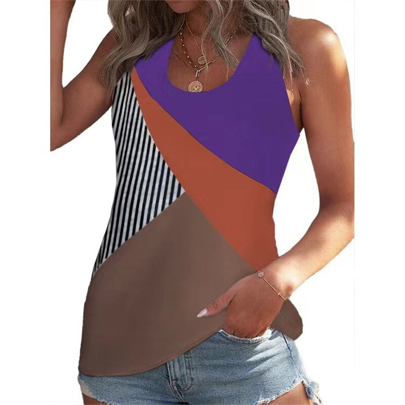 Summer Geometric Print Color Blocking T-Shirt Fashion Women's Sleeveless U Neck Cotton Tees Female Daily Casual Loose Tops Vest