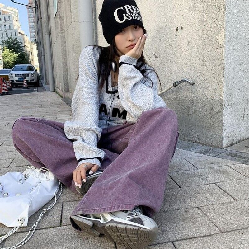 Purple Oversized Pocket Cargo Denim Pants Y2K Streetwear High Waist Straight Baggy Jeans Fashion Oversized Wid Leg Trousers