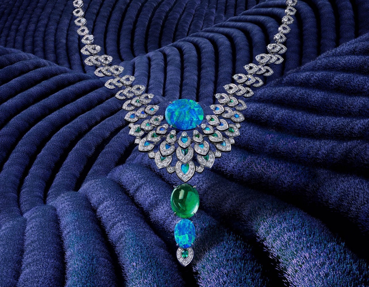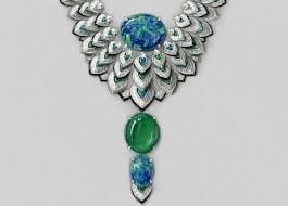 Of all birds, the peacock is possibly the most fascinating. The Ocelle necklace pays tribute to this bird with two opals weighing 16.59 and 6.19 carats respectively, and a 21.18-carat Zambian emerald pendant. The ocelli, the famous spots in the peacock's plumage, are miniaturised and multiplied into a stylised and graphic whole. Each motif is highlighted by an onyx trim. These small feathers partly overlap each other and are mobile enough to lift up slightly, thanks to invisible articulations which constitute the body of the necklace and provide it with extreme suppleness. The opals and emerald are cut and mounted on the pavilion to allow an invisible setting. The upper opal may be detached and worn as a brooch.