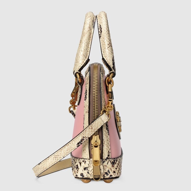 The Boundless Overture collection presents a new mini version of the Gucci Horsebit 1955 handbag in pale pink leather with precious python trim. The bag is embellished with the iconic horsebit hardware, reminiscent of the brand's long equestrian heritage.