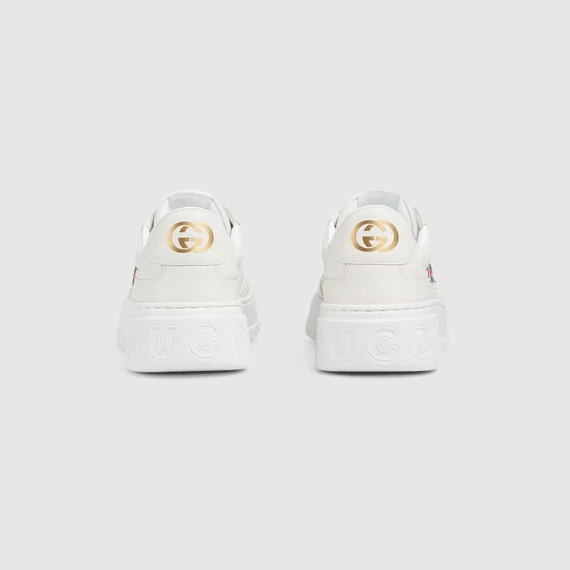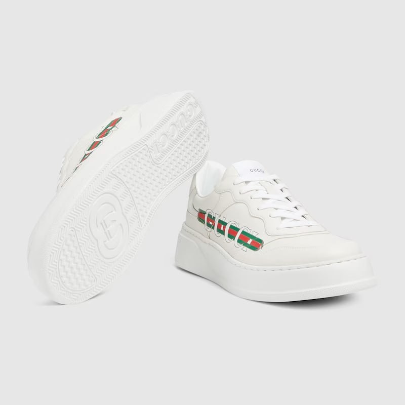 This sneaker's chunky silhouette gives it a playful, retro feel. Gucci's collections continue to look to other eras. This pair of sneakers is crafted in white Demetra, a material created with the same processes used for tanning, the new material offers pliable and resilient performance with a supple finish. A Gucci Web print completes the style.